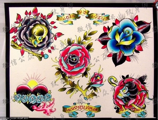 一组漂亮的彩色玫瑰花纹身图案
