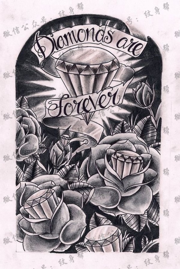 漂亮唯美的黑灰玫瑰花与钻石纹身手稿