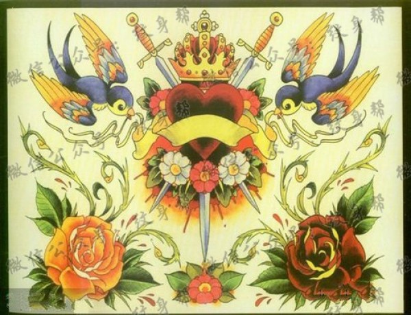 一组漂亮潮流的燕子玫瑰花爱心皇冠纹身手稿
