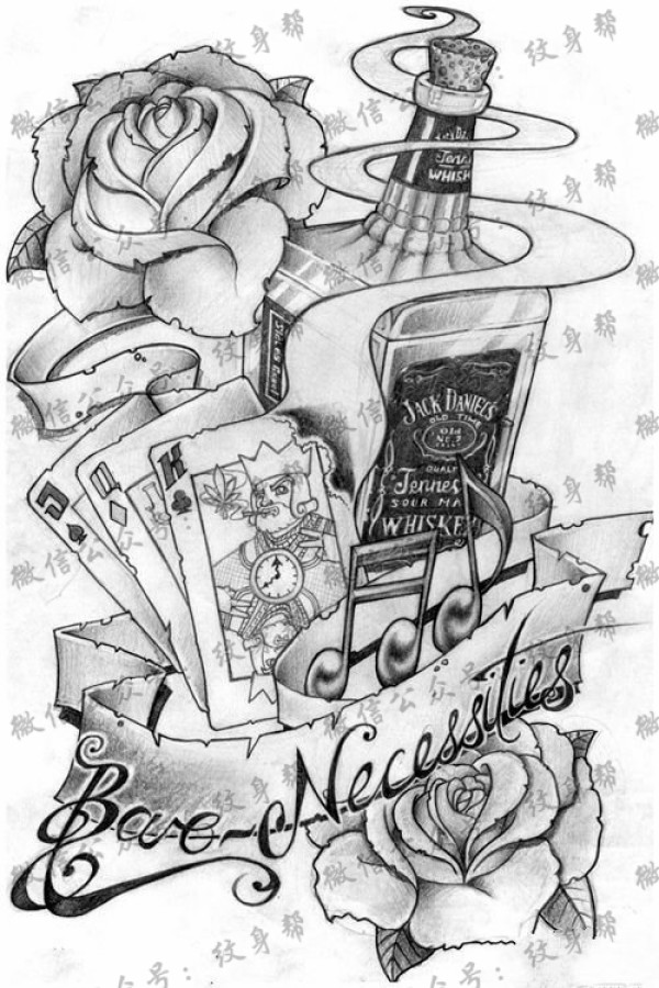 欧美风一款威士忌扑克牌玫瑰花纹身手稿