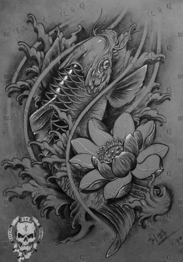 唯美时尚的一款黑灰鲤鱼纹身手稿