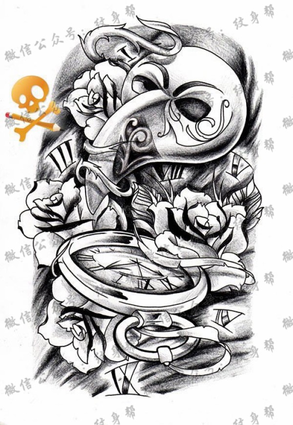 一款潮流唯美的怀表与玫瑰花纹身手稿