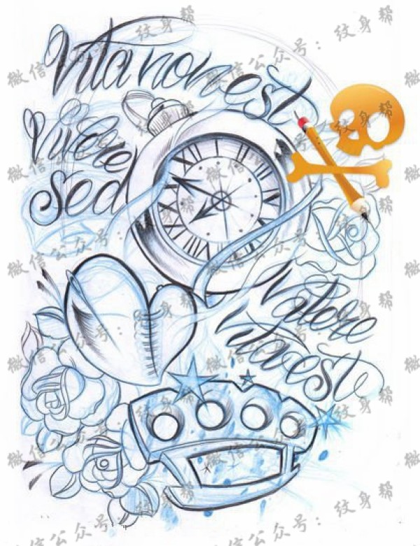 一款潮流时尚的怀表爱心拳刺纹身手稿