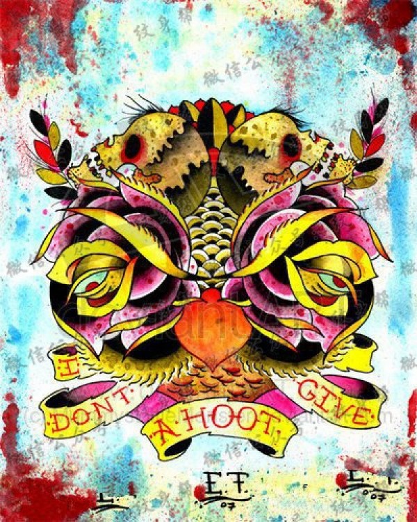 一款另类经典的猫头鹰玫瑰骷髅纹身手稿