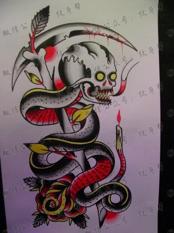 时尚很酷的一款蛇与死神镰刀纹身图案