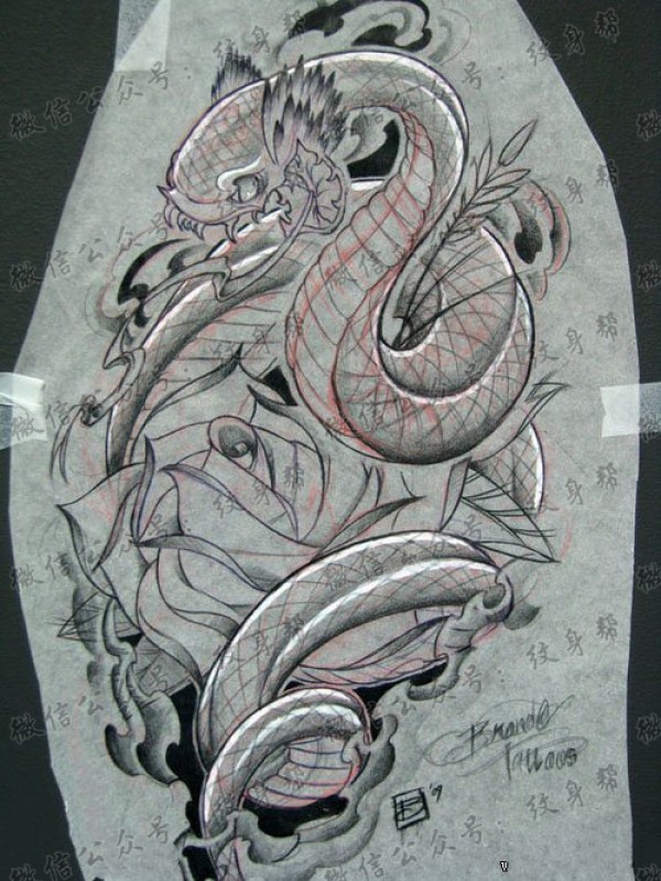 时尚很帅的一款蛇玫瑰花纹身手稿