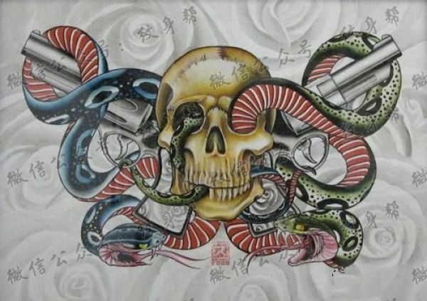时尚很帅的一款骷髅蛇手枪纹身图案