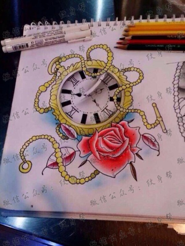 时尚潮流的一款怀表玫瑰花纹身手稿