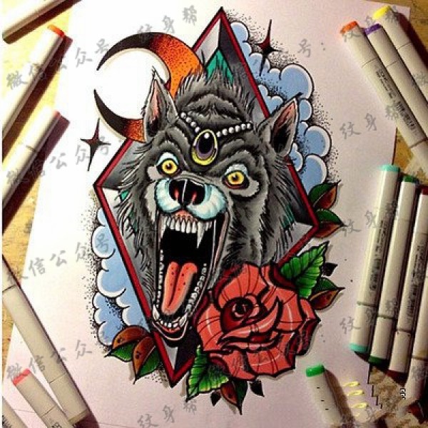 狼头玫瑰花纹身图案由武汉纹身馆推荐