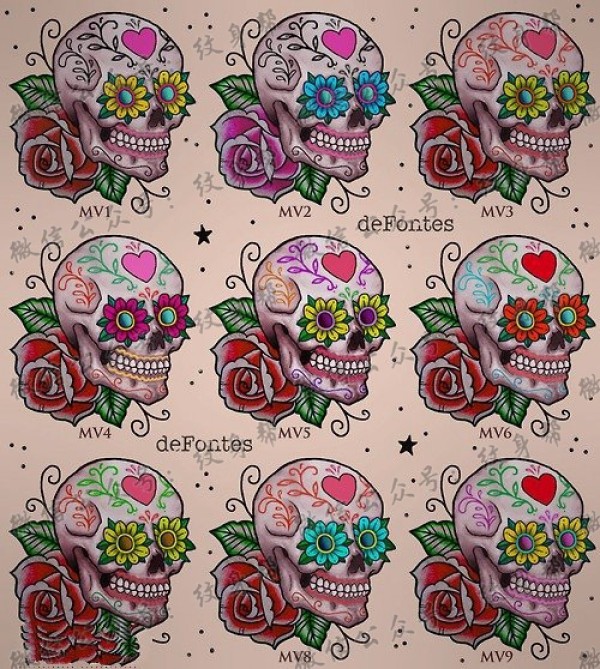 个性的骷髅头玫瑰花纹身手稿图案