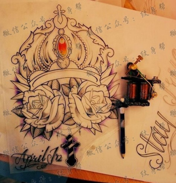 皇冠玫瑰花十字架纹身手稿图案