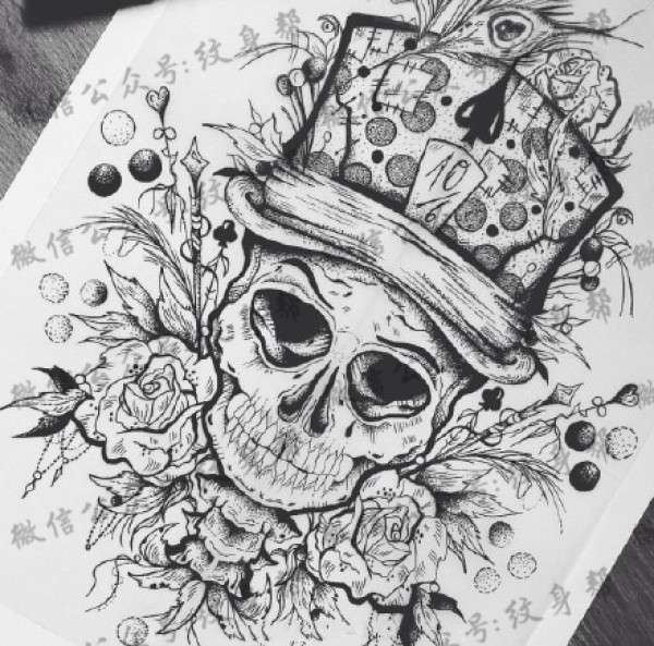 骷髅纹身手稿—一组17张戴帽子的骷髅纹身手稿图案素材