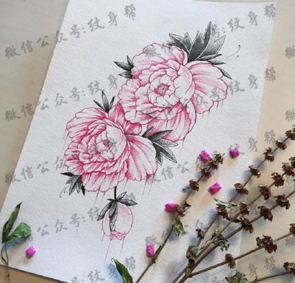一组15张粉红色主题动物和花朵纹身手稿图案