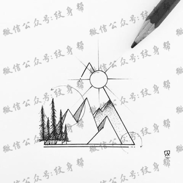 山脉纹身手稿_一组18张几何元素+山脉风景纹身手稿图案