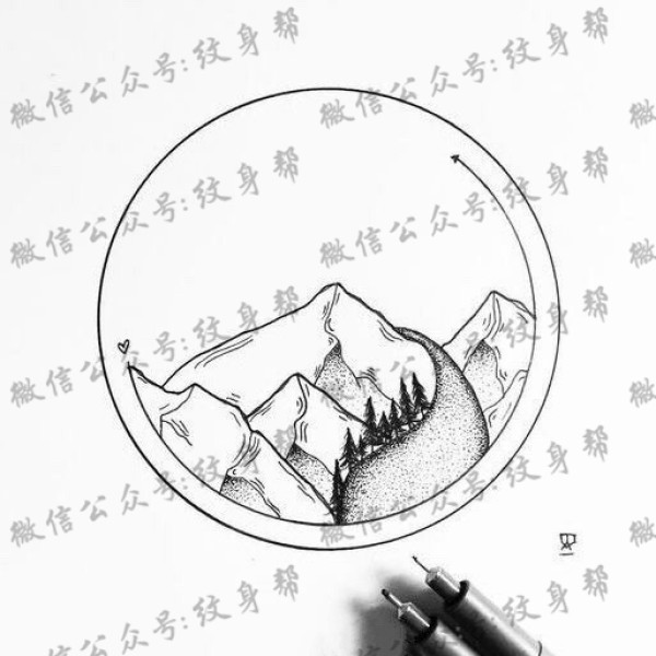 山脉纹身手稿_一组18张几何元素+山脉风景纹身手稿图案