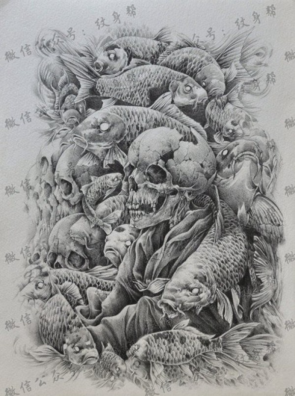 一组满背大气九龙拉棺纹身图案作品和手稿