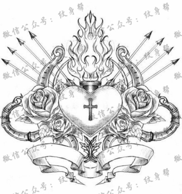 玫瑰花爱心十字架火焰箭头纹身手稿图案