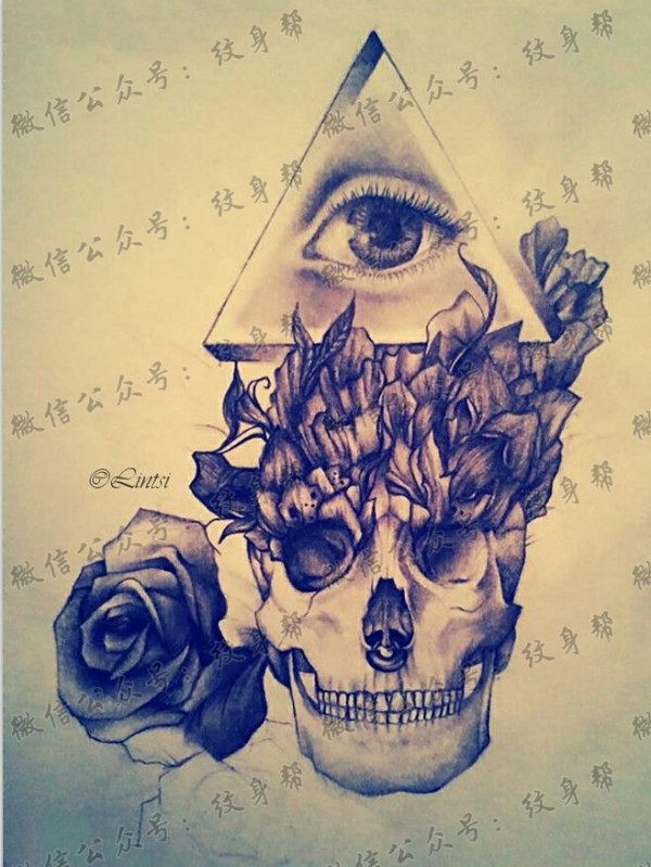 经典骷髅上帝之眼玫瑰花纹身手稿图案