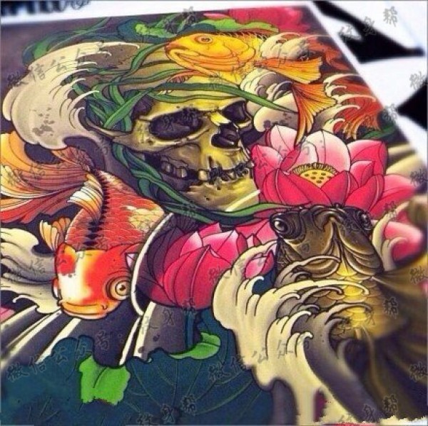 彩色传统骷髅莲花鲤鱼纹身手稿图案