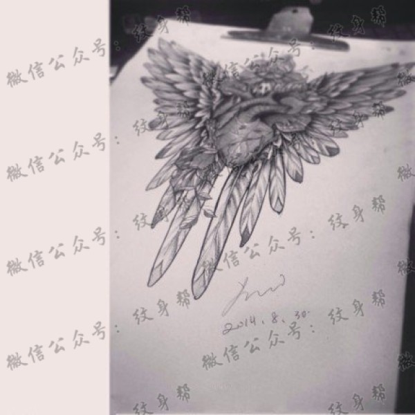 黑灰心脏翅膀纹身手稿图案