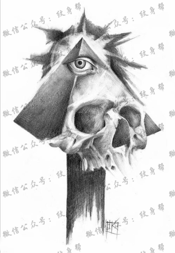 黑灰素描骷髅上帝之眼纹身手稿图案
