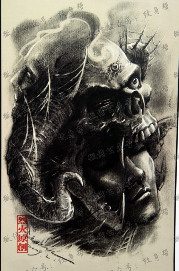 一组满背大气九龙拉棺纹身图案作品和手稿