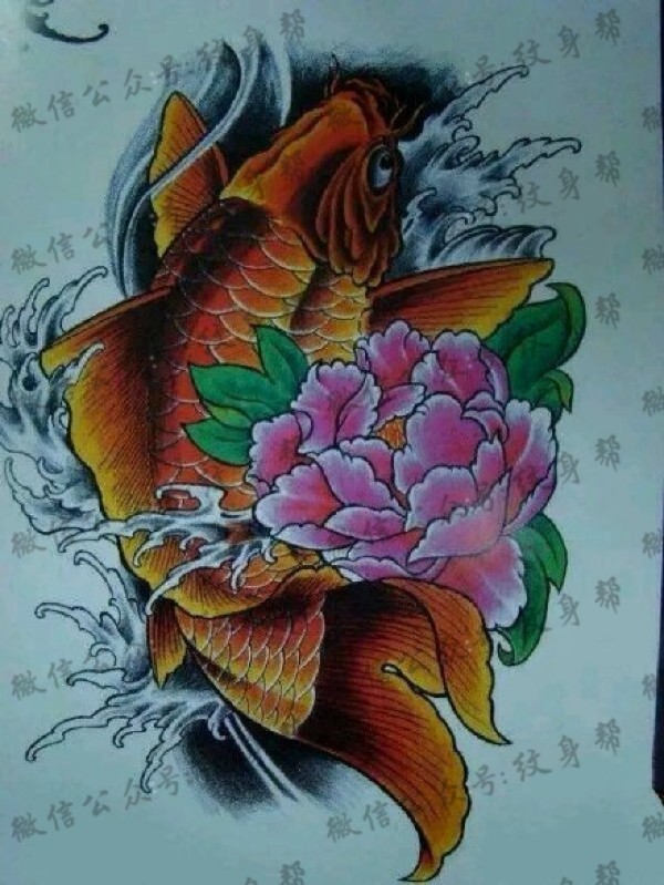 经典彩绘娇艳的牡丹锦鲤纹身图案