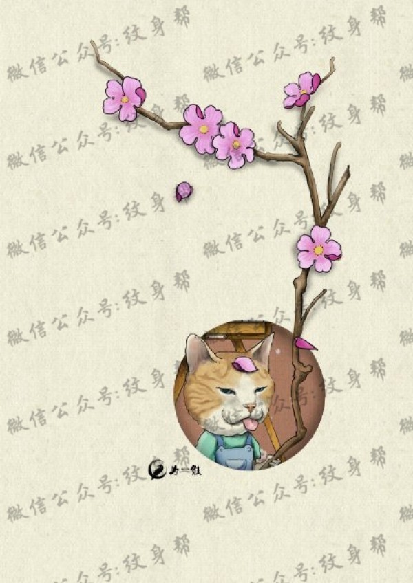 水彩猫咪樱花纹身图案