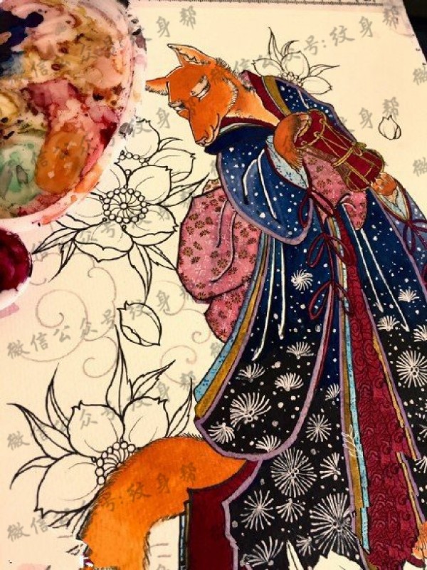 手稿彩绘狐狸纹身图案