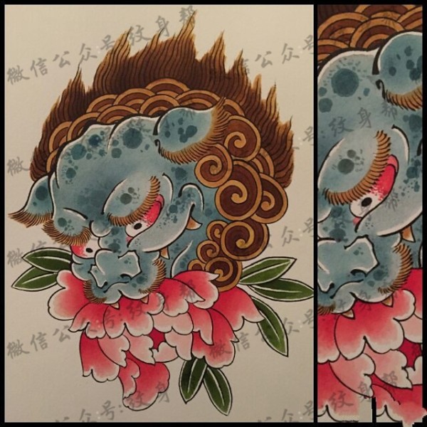 半甲唐狮手稿 传统的9款唐狮主题半甲纹身手稿图片