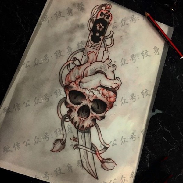 骷髅心脏匕首纹身图案手稿