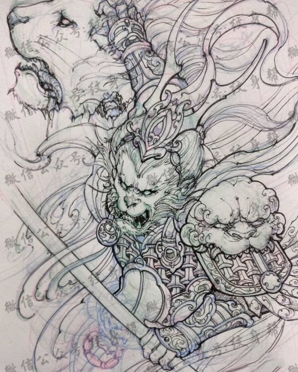 半甲唐狮手稿 传统的9款唐狮主题半甲纹身手稿图片