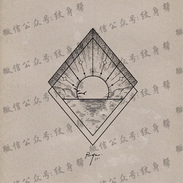 几何线条太阳大海纹身图案手稿
