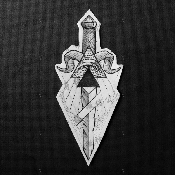 点刺上帝之眼匕首几何线条纹身图案手稿