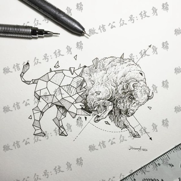 公牛点刺几何线条纹身图案手稿