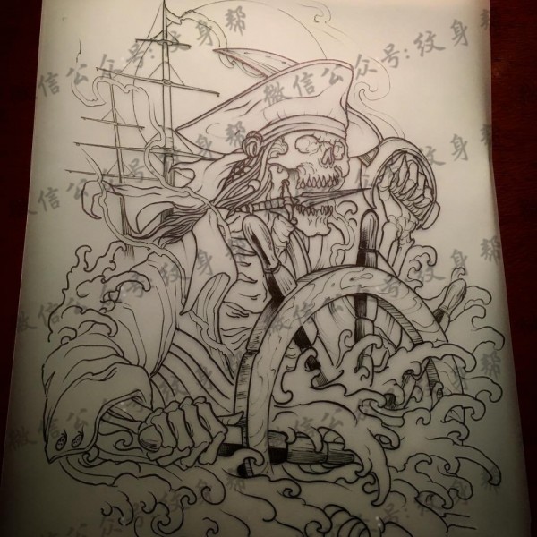 school欧美帆船骷髅船长海浪纹身线条图案手稿