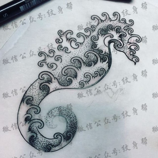 海马浪花点刺纹身图案手稿