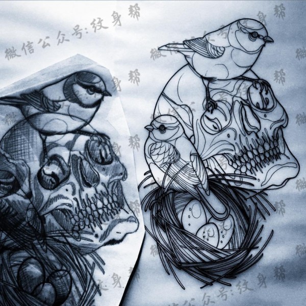 欧美school鸟骷髅纹身图案手稿