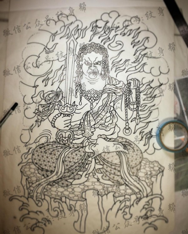 满背不动明王纹身图案手稿