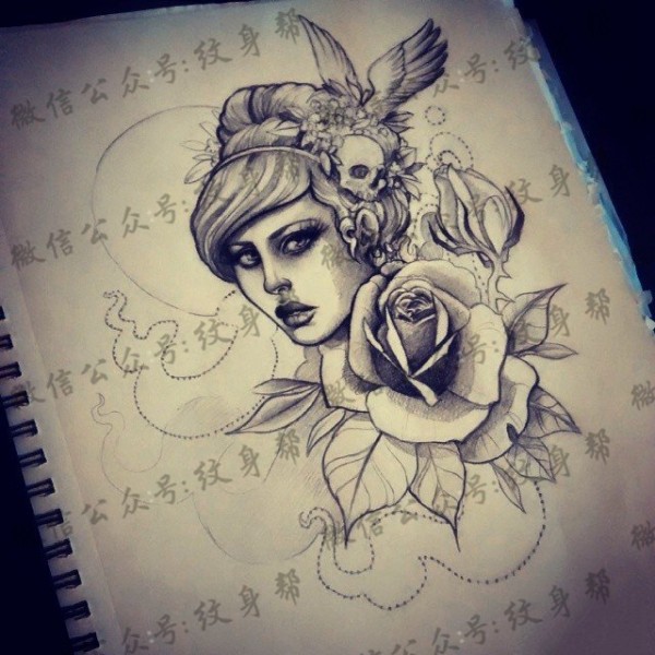 school女郎玫瑰骷髅纹身图案手稿