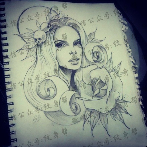 school女郎玫瑰骷髅纹身图案手稿