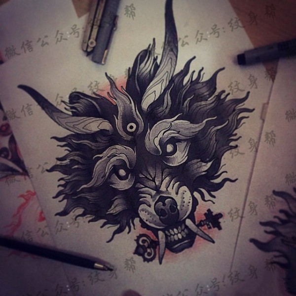 半甲唐狮手稿 传统的9款唐狮主题半甲纹身手稿图片