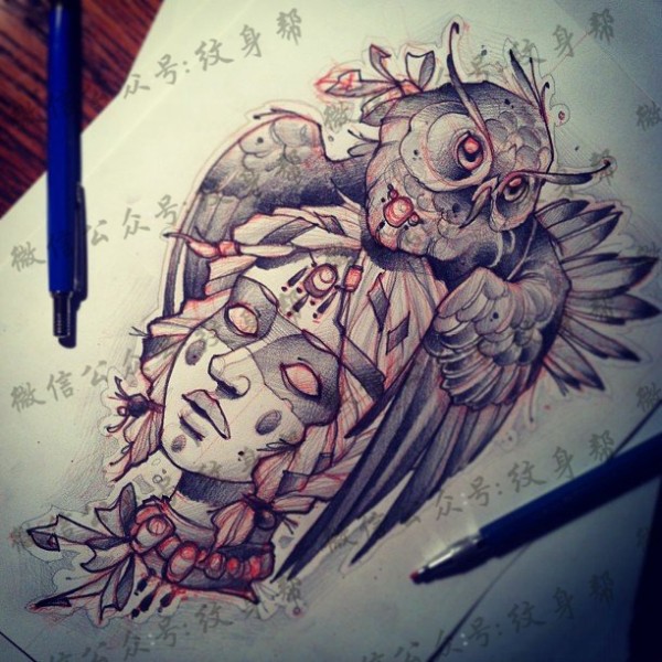 欧美schoo猫头鹰l女郎纹身图案手稿