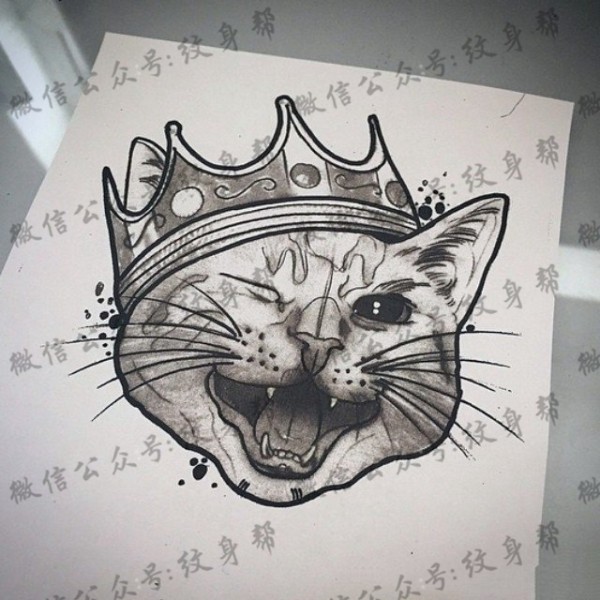 欧美猫皇冠纹身图案手稿