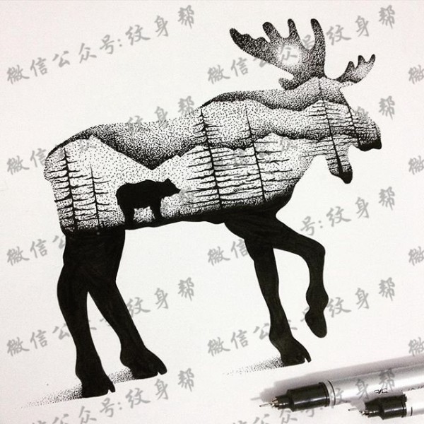 欧美点刺麋鹿熊树林纹身图案手稿