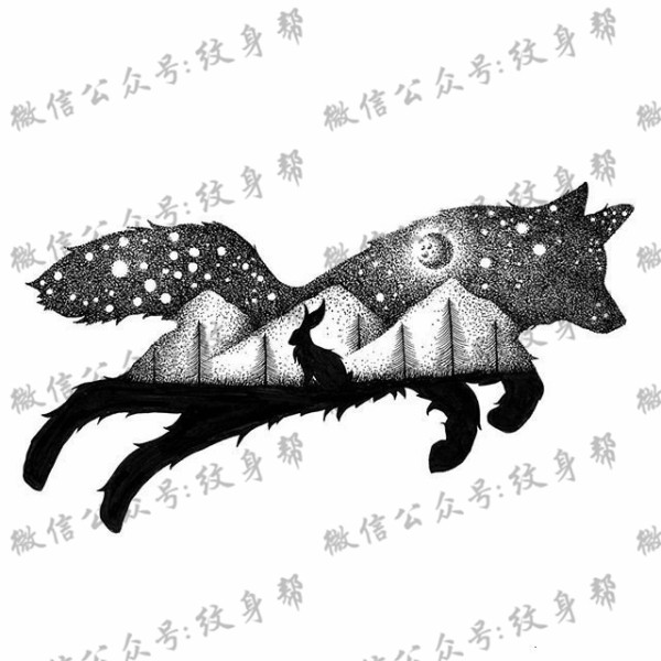 点刺狐狸兔子树林纹身图案手稿