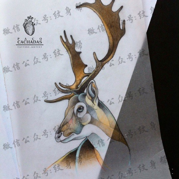 欧美school彩色麋鹿纹身图案手稿