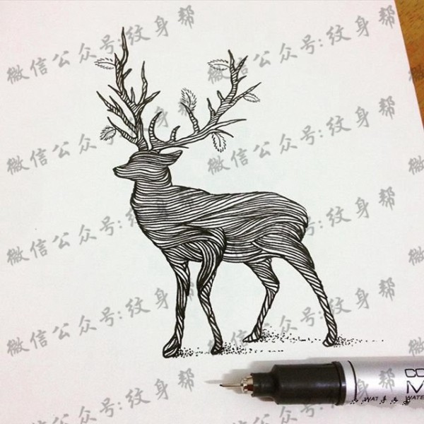 欧美school彩色麋鹿纹身图案手稿