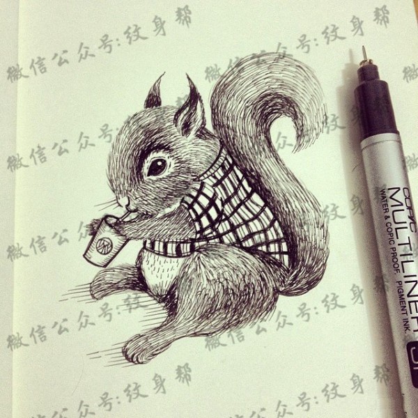 小清新松鼠点刺欧美纹身图案手稿
