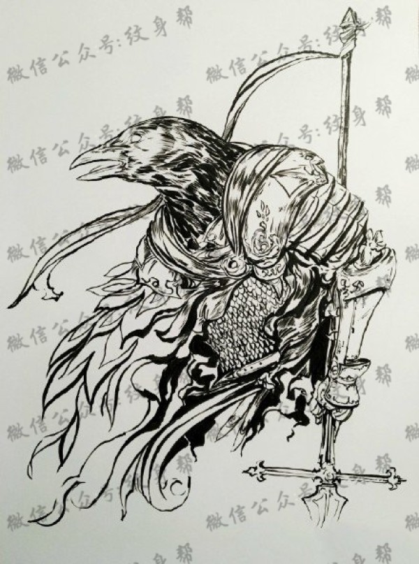 传统乌鸦武士纹身图案手稿